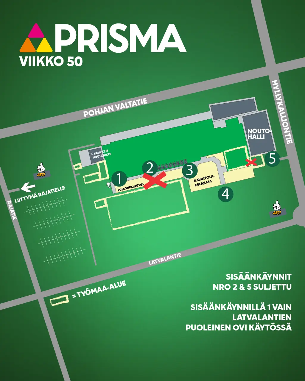 Työmaa-alue on siirtynyt RautaPrismassa Latvalantien puoleiseen osaan ja sisäänkäynti nro 5 on suljettu. Osa RautaPrisman tuotteista löytyy noutohallista, johon kulku käy noutohallin pikkuovesta. Joulukuuset pitävät paikkansa 5-oven läheisyydessä.Sisäänkäynnit 2 & 5 on suljettu ja sisäänkäynnillä 1 on vain Latvalantien puoleinen ovi käytössä. Alkon läheisyydessä oleva Otto-automaatti on siirtynyt vastakkaiselle, ilmoitustaulun puoleiselle seinälle. Kauppakassin noutopisteen kulku onnistuu työmaa-aitojen välistä opasteita noudattaen.