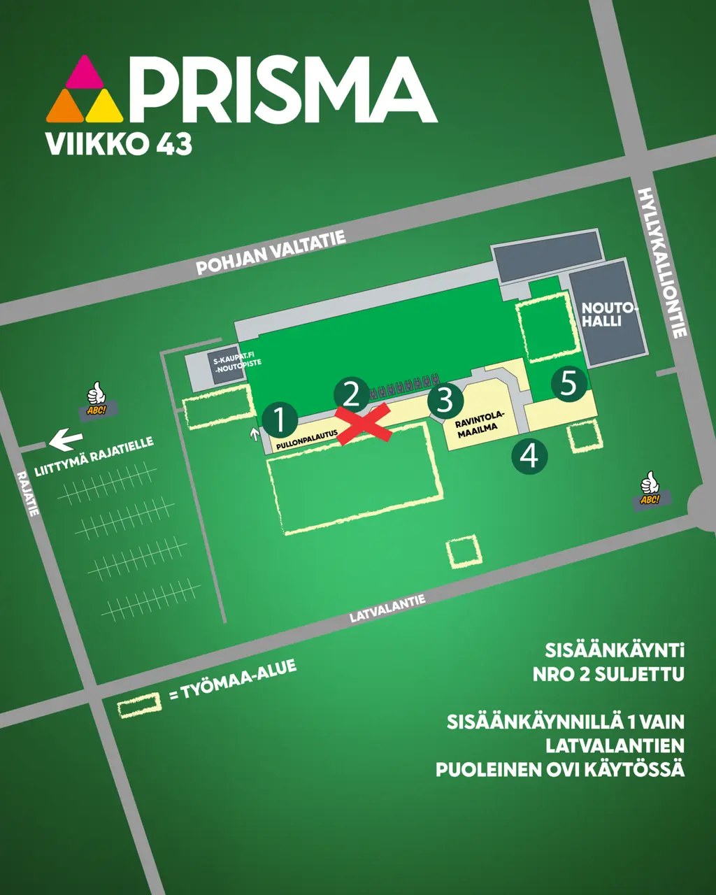 Prisman uudistustyöt ovat siirtyneet sisätiloihin ja kattavat tällä hetkellä noin puolet RautaPrismasta. Latvalantien puoleinen osa RautaPrismaa on käytössä ja sinne kulku käy käytävän 77 päädystä sekä normaaliin tapaan sisäänkäynniltä numero 5. Osa RautaPrisman tuotteista löytyy entisestä noutohallista, sinne käynti RautaPrisman kassan vierestä. Paristot, palovaroittimet ja lamput löytyvät RautaPrismasta käytävien 119-123 läheisyydestä. Mikäli et löydä etsimääsi tuotetta, kysy henkilökunnaltamme neuvoa.
