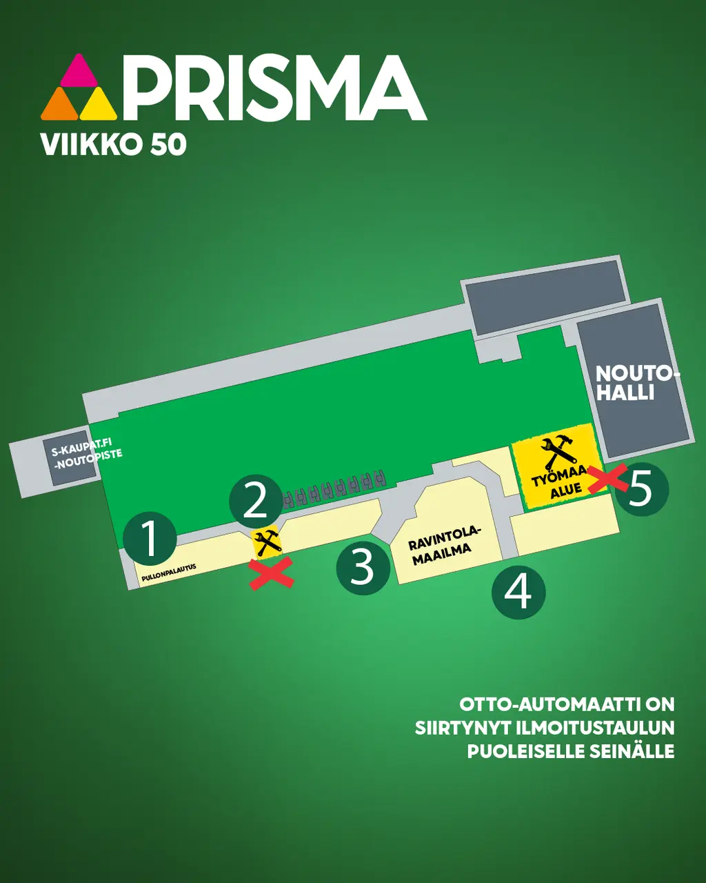 Jos muutostöiden aikana asiointi ei tunnu mieluisalta, voit hyödyntää verkkokauppojamme!Päivittäistavaratuotteet tilataan s-kaupat.fi ja noudetaan noutopisteeltä.Käyttötavaratuotteet tilataan prisma.fi ja noudetaan Prisman käytävältä Prisman omasta pakettiautomaatista ilman toimituskuluja.