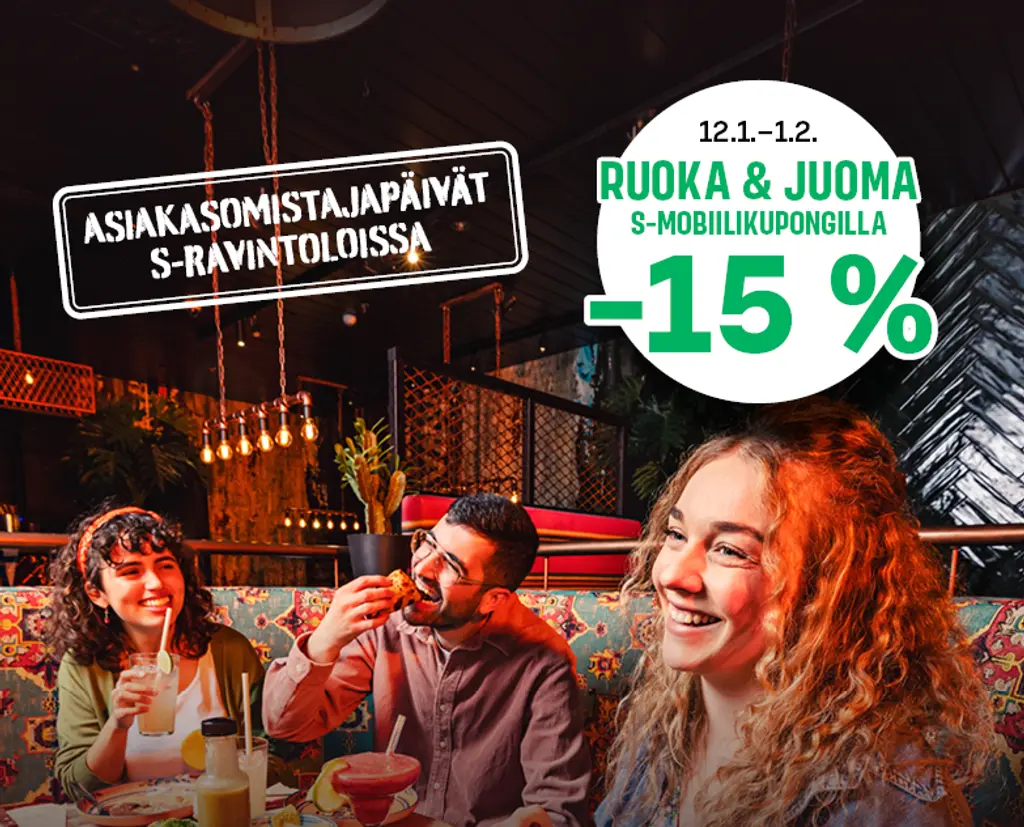 Saat 15 % alennuksen ruoasta ja juomasta näyttämällä S-mobiilin etukuponkia ravintolassa maksaessasi. Yksi etu/henkilö. Koko seurue saa alennuksen, kun kupongin käyttäjä maksaa koko laskun. Alennuksen saa asiakasomistajahinnoista ja take away - tuotteista. Etu ei koske lounasannoksia, yli alc. 22 % alkoholituotteita, Hesburger-ravintoloita tai kotiinkuljetuksia (Foodora). Pizza & Buffa -ravintoloissa etu voimassa klo 15 jälkeen. Ei voi yhdistää muihin etuihin, kuten etukuponkeihin.