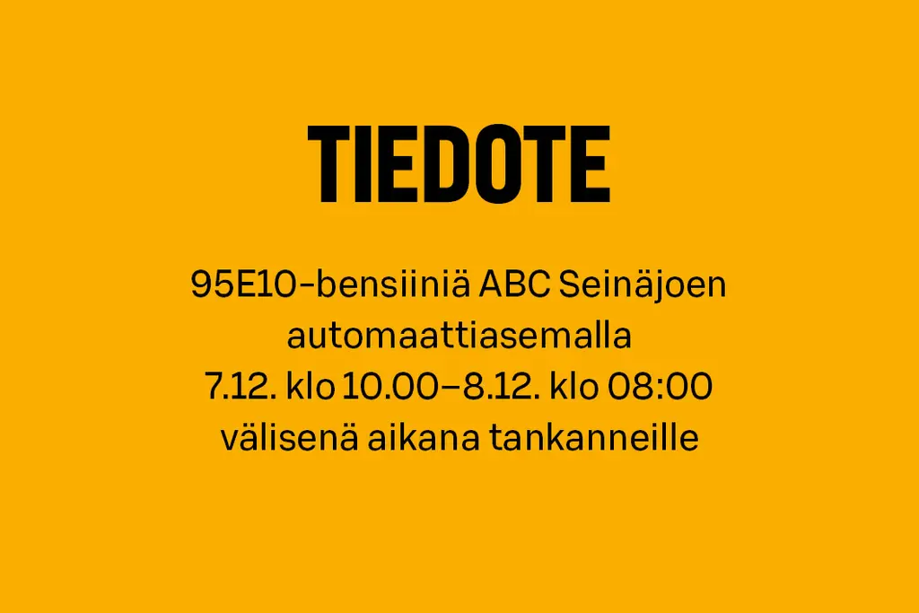 ABC Seinäjoen (Verkatehtaankatu 13, 60100 Seinäjoki) automaattiasemalla on havaittu, että 95E10-bensiinin säiliöön on sekoittunut vettä. Polttonesteiden myynti asemalla keskeytettiin välittömästi, kun epäilys sekoittumisesta tuli ilmi.Bensiiniin sekoittunut vesi voi aiheuttaa esimerkiksi käyntihäiriöitä ajoneuvoissa. Mikäli olet tankannut 95E10-bensiiniä ABC Seinäjoella 7.12. klo 10.00–8.12. klo 08:00 välisenä aikana ja autossasi ilmenee poikkeavaa käytöstä, pyydämme viemään auton huoltoon ja olemaan yhteydessä Etelä-Pohjanmaan Osuuskauppaan.Pyrimme tavoittamaan kaikki kyseisenä ajankohtana asemalla mainittua bensiiniä tankanneet asiakkaat myös henkilökohtaisesti. Pahoittelemme tapahtunutta ja siitä mahdollisesti aiheutunutta haittaa.Lisätietoja ja toimintaohjeita:Heli Back