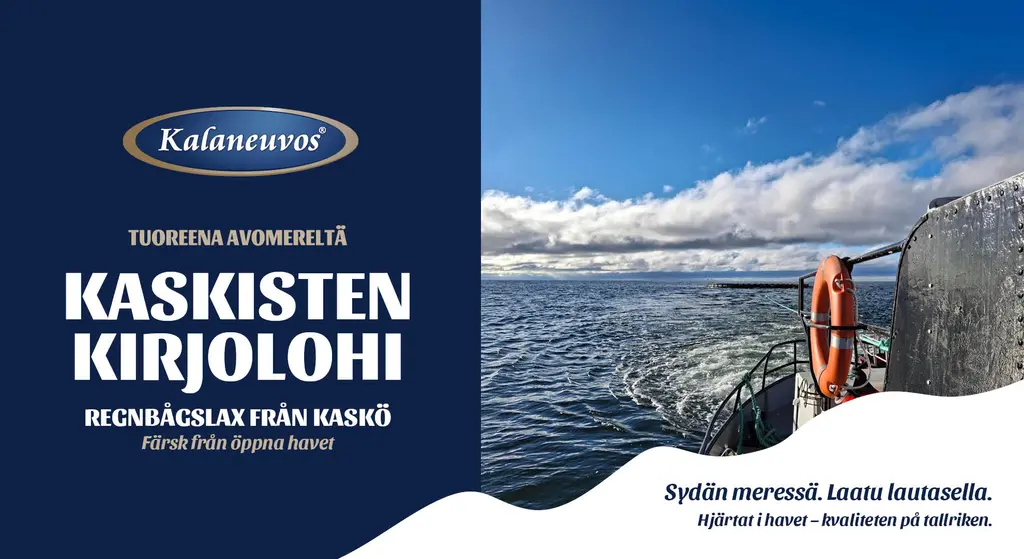 I slutet av 2023 fick Nordic Trout, Finlands största fiskodlingskoncern som ägs av Nordic Fish och är känd för varumärket Kalaneuvos, ett nytt fiskodlingstillstånd i Kaskö. Syftet med tillståndet är att öka den inhemska fiskproduktionen, det vill säga tillgången på regnbågslax, och säkerställa tillgången på finländsk fisk. Fredagen den 24.10. 2025 anländer en av de första partierna av regnbågslax som odlats på öppet hav i Finland till alla marknadsenheter inom Etelä-Pohjanmaan Osuuskauppa!Varför Kaskö regnbågslax?🐟 Fisken växer ungefär 10 km från Kaskös kust ute på öppet hav, där den verkligen får använda sina muskler! Laxen simmar hela tiden, vilket ger ett fantastisk muskelkvalitet.🐟 Miljöpåverkan från havsodlingen är betydligt mindre eftersom fisken mår bättre och utnyttjar sin näring mer effektivt.🐟 Kaskö rengbågslax kommer i framtiden att representera förstklassig fisk av restaurangkvalitet, som är känd över hela landet.